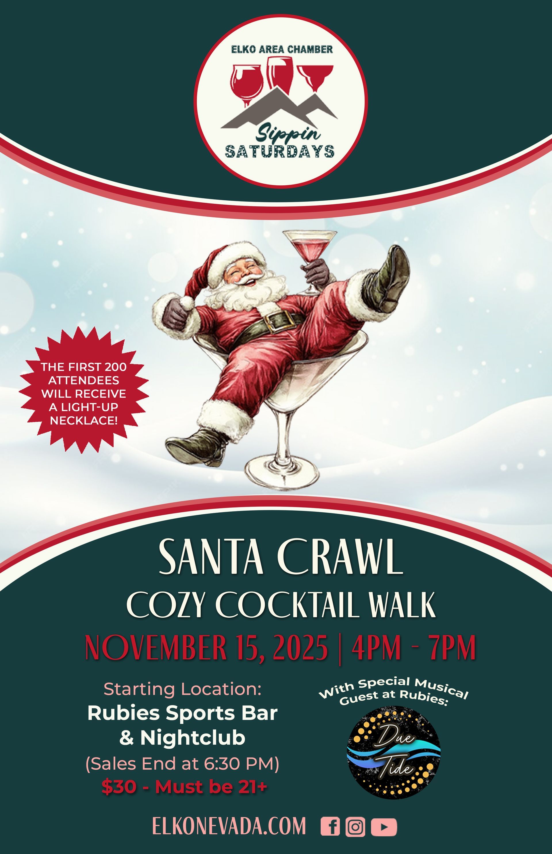 Join the Elko Area Chamber for their final Sippin' Saturday Series of the year with the Santa Crawl Cozy Cocktail Walk on Saturday, November 15th.